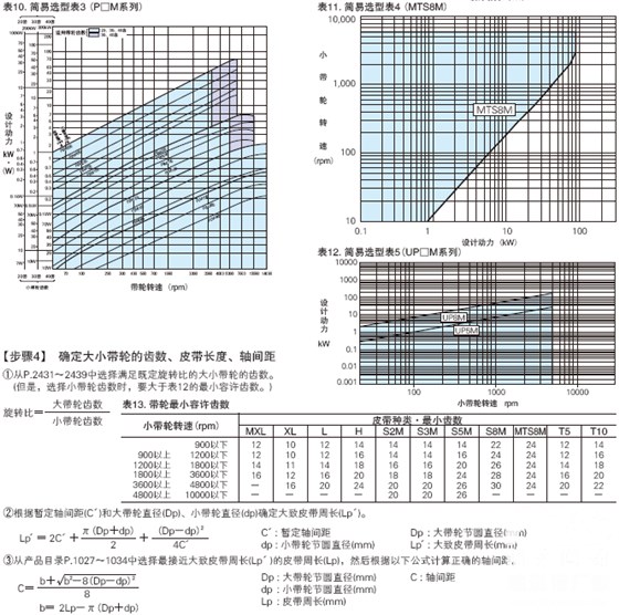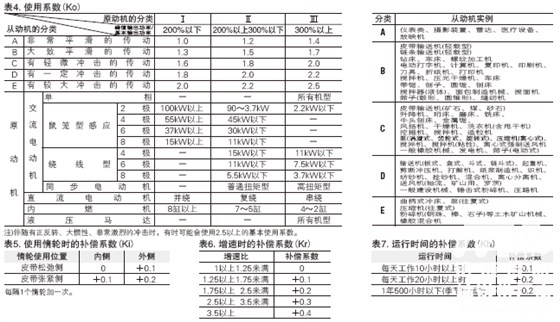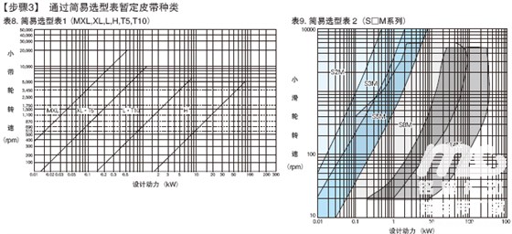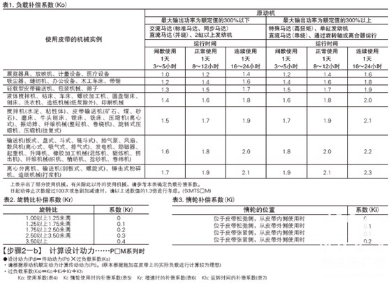 9、其他使用条件 【步骤2-a】 计算设计动力……MXL/XL/L/H/S□M/MTS□M系列时 ●设计动力(Pd)=传动动力(Pt) M过负载系数(Ks) ·请根据原动机额定动力计算传动动力(Pt)。(原本根据施加在皮带上的实际负载进行计算较为理想) ·过负载系数(Ks)=Ko+Kr+Ki Ko: 负载补偿系数(表1) Kr: 旋转比补偿系数(表2) Ki: 惰轮补偿系数(表3)